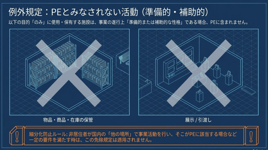 物品の保管、展示、引渡しのみに使用される施設など、事業遂行上「準備的または補助的な性格」である場合は、原則として恒久的施設には含まれません。ただし、他の場所での活動が一定の要件に該当し、全体として恒久的施設とみなされる場合はこの例外は適用されません。