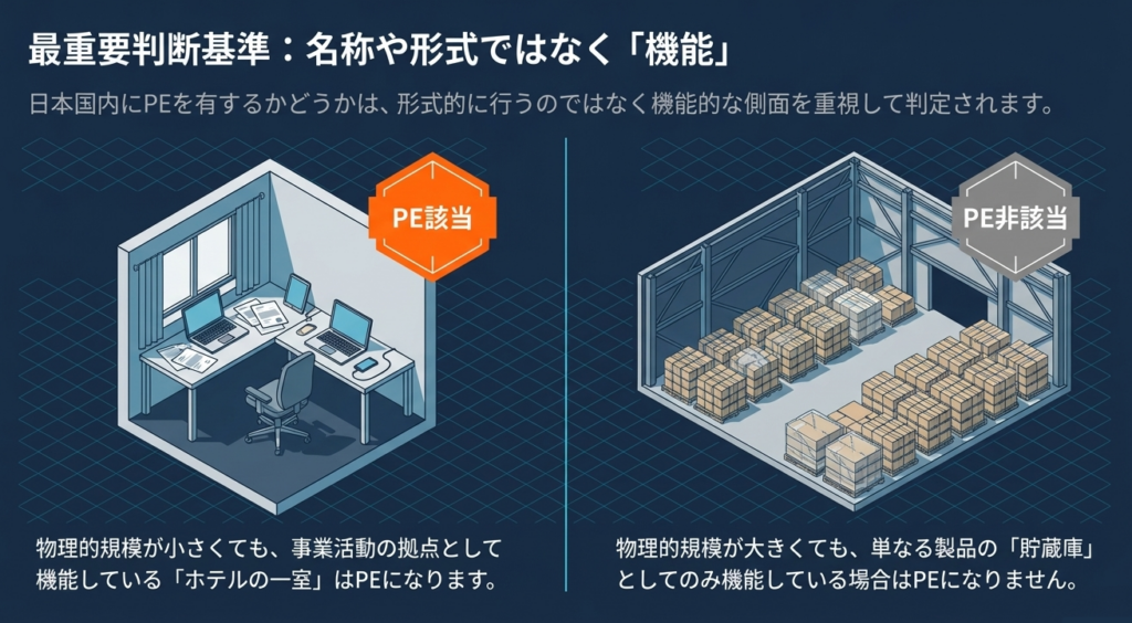 形式的な判断ではなく、機能的な側面を重視して判定されます。例えば、事業活動の拠点となっているホテルの一室は恒久的施設に該当しますが、単なる製品の貯蔵庫は該当しないといった実態に即した判断がなされます。