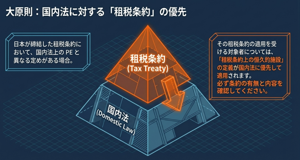 なお、租税条約に異なる定めがある場合は、条約上のPE規定が優先されます。