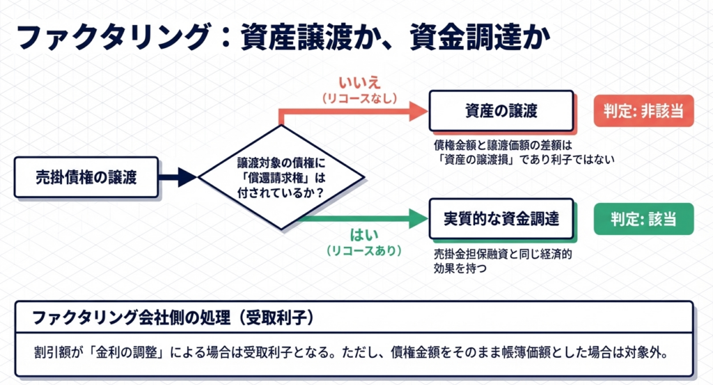 | ファクタリング費用(償還請求権なし) | 非該当 | 資産(売掛債権)の譲渡損であり、負債から生じる利子ではない。 |