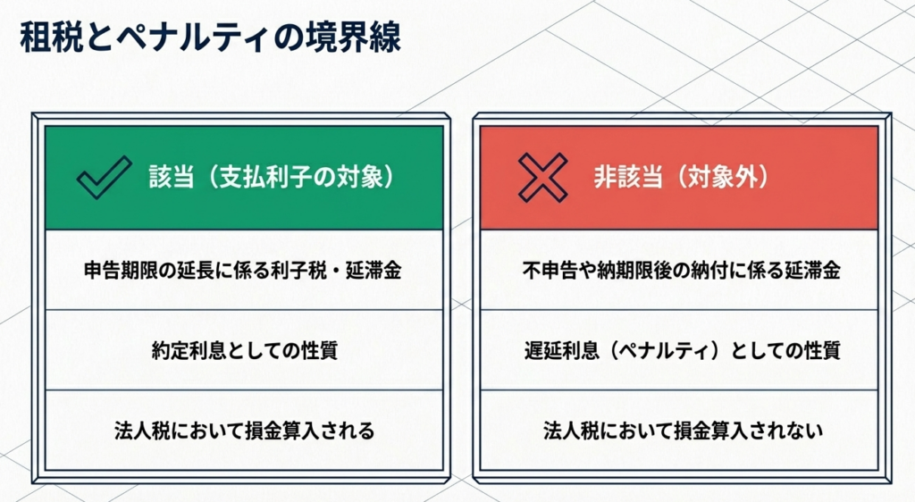 | 利子税(申告期限延長に係るもの) | 該当 | 法人税で損金算入され、約定利息の性質を有するため。 |
