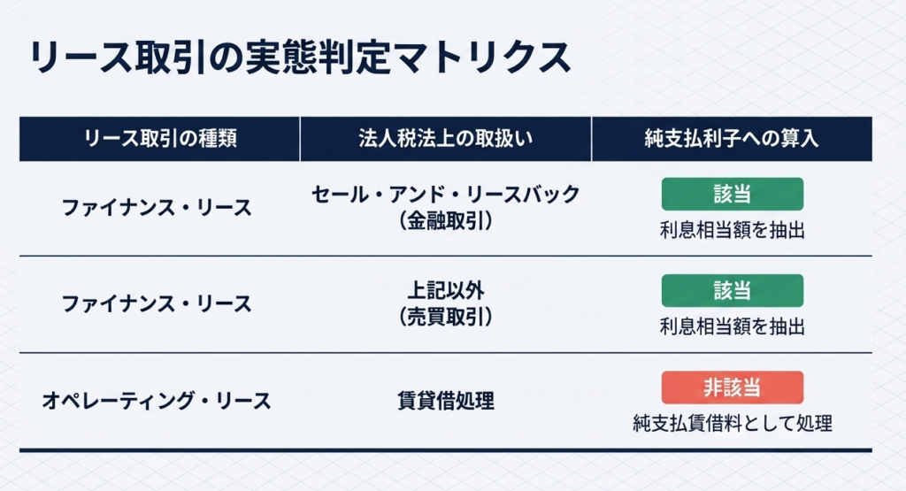 法人税法上で「資産の売買」または「金銭貸借」とされるリース取引(ファイナンス・リース等)が対象となります。これに対し、法人税法上で「賃貸借取引」として扱われるリース取引(オペレーティング・リース等)の利息相当額は、純支払利子には含めません。