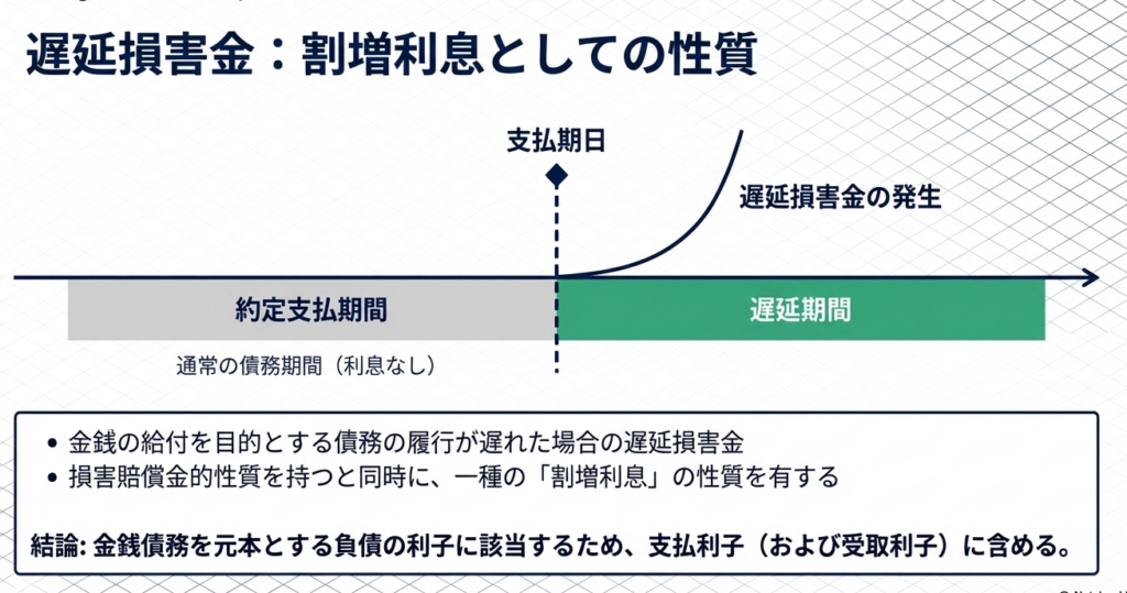 遅延損害金は損害賠償金としての性質を持つ一方で、金銭債務を元本とする負債の利子(一種の割増利息)としての性質も有しているためです。このため、実態に即して支払利子および受取利子の範囲に含まれるものとされています。