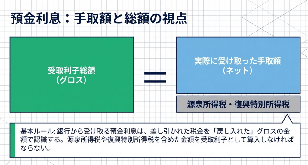 銀行から入金される利息は、源泉所得税および復興特別所得税(計15.315%、地方税除く)が差し引かれた後の金額です。これをそのまま集計してはいけません。必ず税引前の「総額」に引き直して受取利子に計上してください。