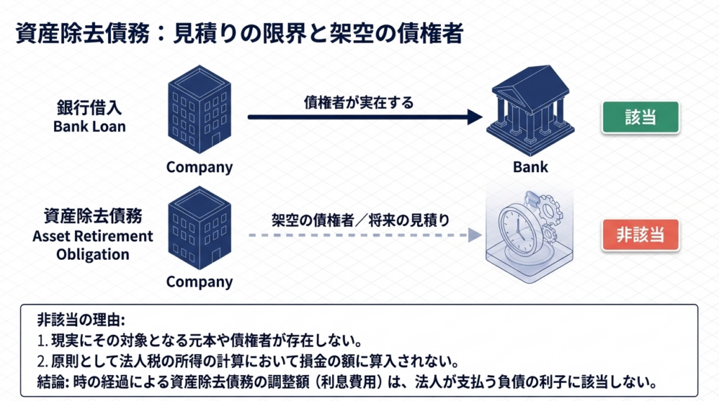 | 資産除去債務に係る利息費用 | 非該当 | 現実の元本や債権者が存在せず、法人税上の負債利子に当たらない。 |