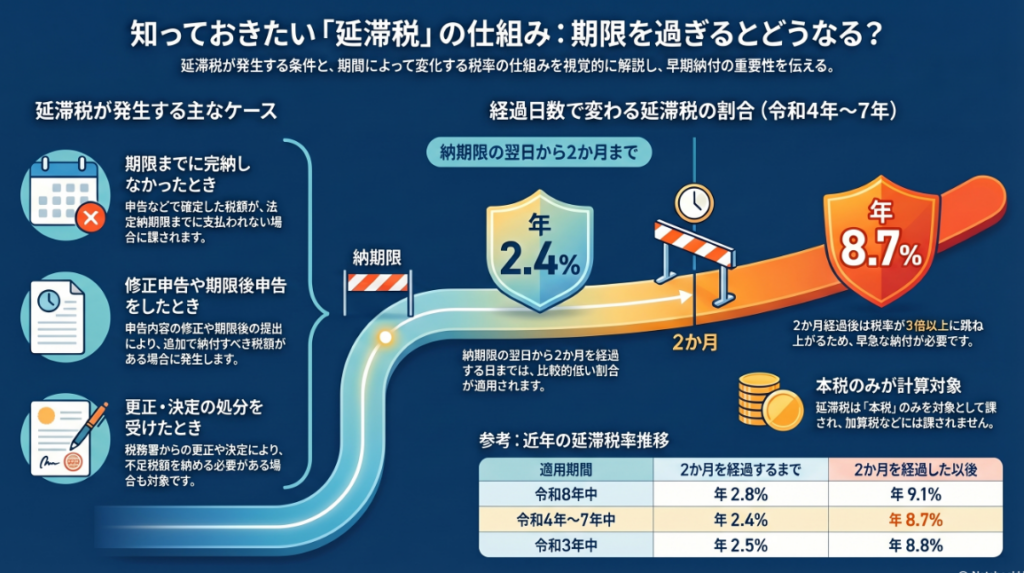 主に申告漏れや修正申告等で未納税額がある場合に課されますが、申告提出から1年以上経って修正申告等があった場合、不正行為がなければ一定期間を延滞税の計算に含めない特例も存在します。納付が遅れるほど税率が上がり負担が増す仕組みとなっています。