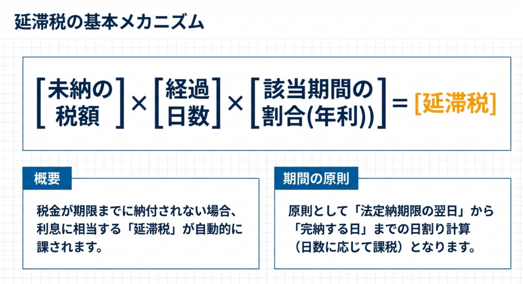 延滞税は、税金が定められた期限までに完納されない場合に課される、利息に相当する税金です。法定納期限の翌日から納付する日までの日数に応じて、自動的に課される仕組みとなっています。