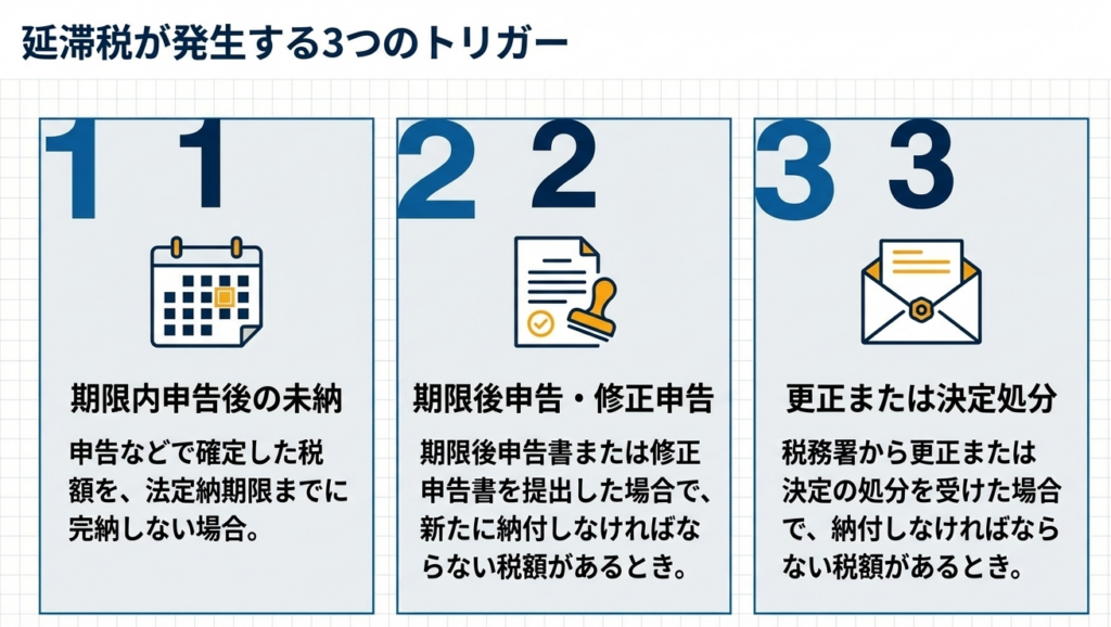 主なケースは、申告等で確定した税額を法定納期限までに完納しないとき、期限後申告書や修正申告書を提出し納付すべき税額があるときです。また、更正または決定の処分を受けた際、納付すべき税額がある場合にも課されます。