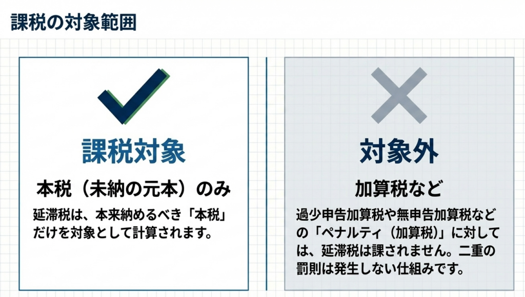 延滞税は本税(所得税や法人税等)のみを対象に計算されます。過少申告加算税などの「加算税」に対しては課されません。