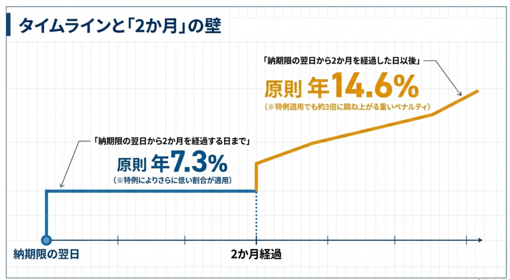 「納期限」から2か月を境に税率が跳ね上がる仕組みです。この「2か月以内」に納税を完了できるかどうかが、実務上のコスト管理における最大の分岐点となります。