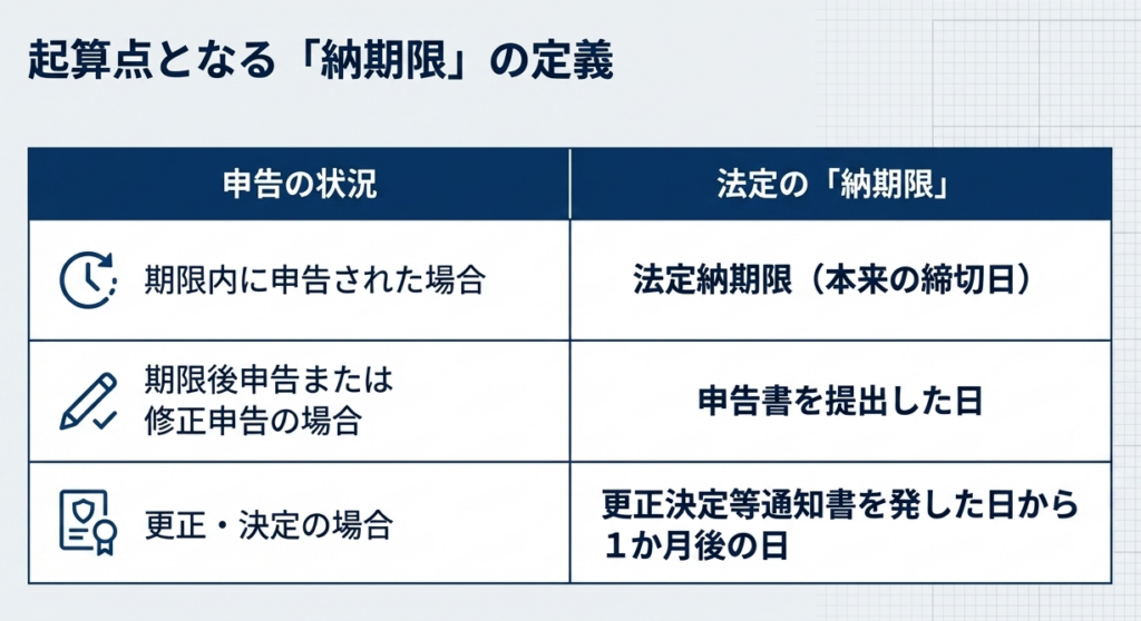 延滞税の計算開始日を左右する「納期限」は、申告の状況によって異なります。ここを誤認すると、2か月の低率期間の判定を誤り、予想外の税負担を招きます。