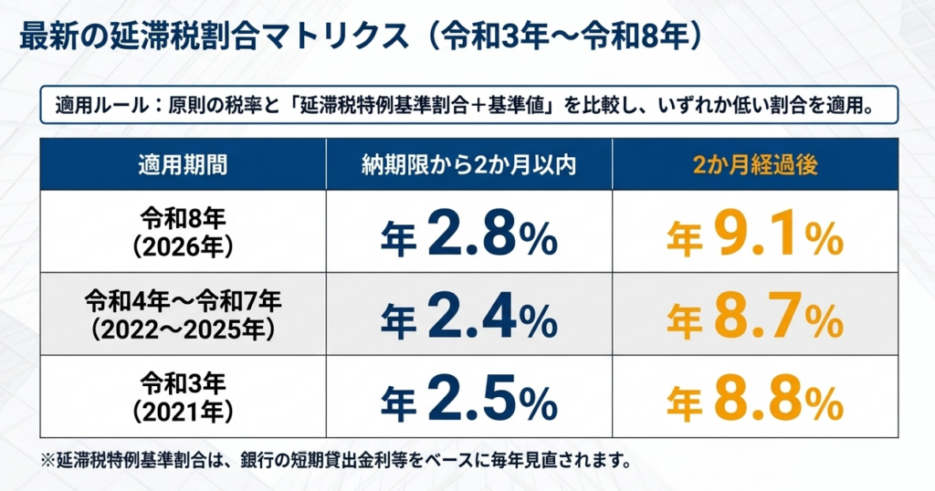 原則的な割合と「延滞税特例基準割合に基づき算出された割合」のいずれか低い方が適用されます。例えば令和4年から令和7年までの期間では、最初の2か月は年2.4パーセント、それ以降は年8.7パーセントとなっています。