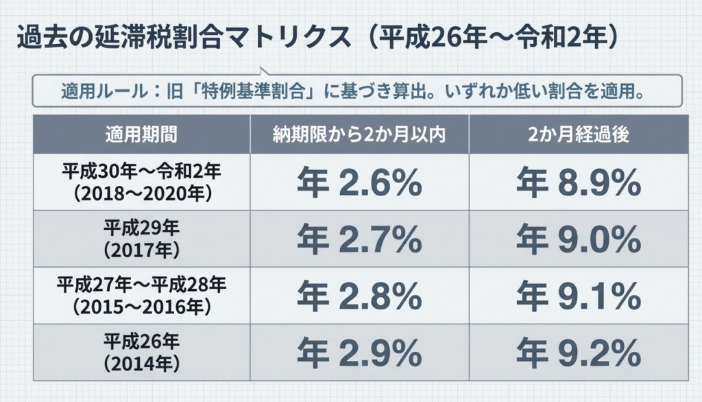 原則は年14.6%ですが、特例により「延滞税特例基準割合+7.3%」の低い方が適用されます。
