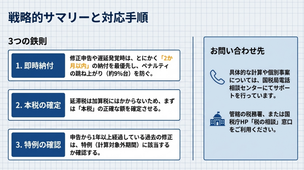 複雑な計算体系を持つ延滞税ですが、実務担当者がまず把握すべき最終的な処理方針は、以下の3点に集約されます。
