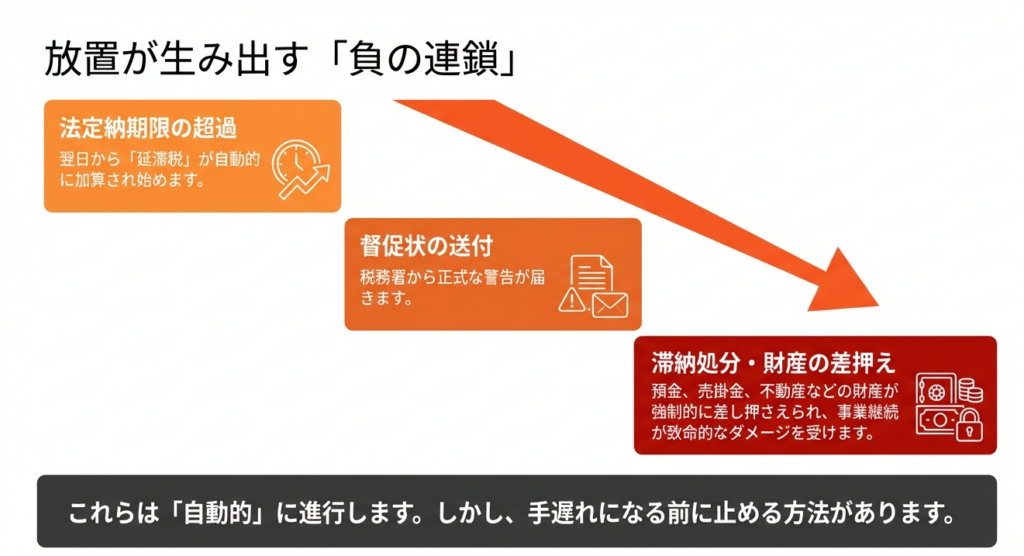 税金の納付期限を守ることは企業の「社会的信用」を維持するための絶対条件です。万が一、期限を徒過すれば、法定納期限の翌日から「延滞税」という名の重い金利負担が自動的に課され、督促後も放置すれば「差し押さえ」という強力な滞納処分が執行されます。