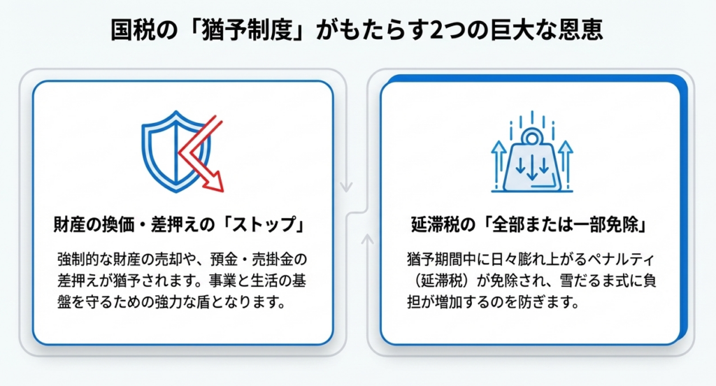 猶予が認められた期間中に発生する延滞税は、その全部または一部が免除されます。既に滞納している期間の遡及的な免除ではなく、「猶予期間中」の金利負担を最小化できる点が、キャッシュフローの改善に大きく寄与します。 - 差し押さえ・換価の回避による事業資産の保護