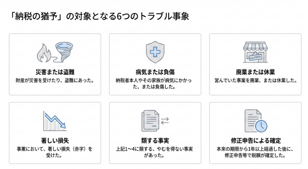 5.「納税の猶予」が適用される具体的な事実(事由)にはどのようなものがありますか?