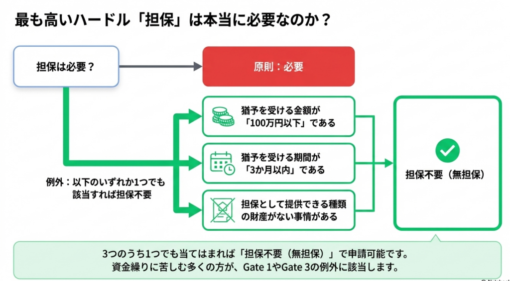 猶予を受ける際は担保提供が原則ですが、以下のいずれかに該当する場合は免除されます。