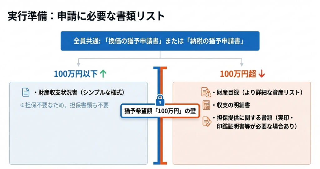 100万円を超える猶予を求める場合、「財産目録」および「収支の明細書」の提出が必須です。- 重要ポイント: