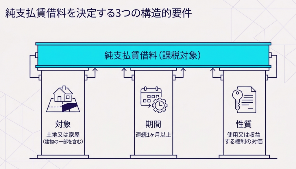 純支払賃借料の該当性を判断する際、実務担当者が貫くべきは「実質主義」の徹底です。以下の3要素をすべて満たす支払いは、その名目(業務委託料、保管料、占用料など)に関わらず、算入対象となります。