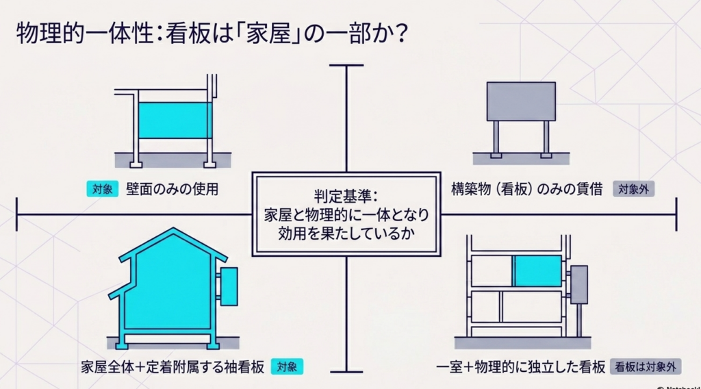| ④ 家屋一式 | 袖看板を含む家屋一式を丸ごと借りる | 該当 | 袖看板が家屋に定着附属し、一体となって効用を果たしている(物理的一体性)。 |