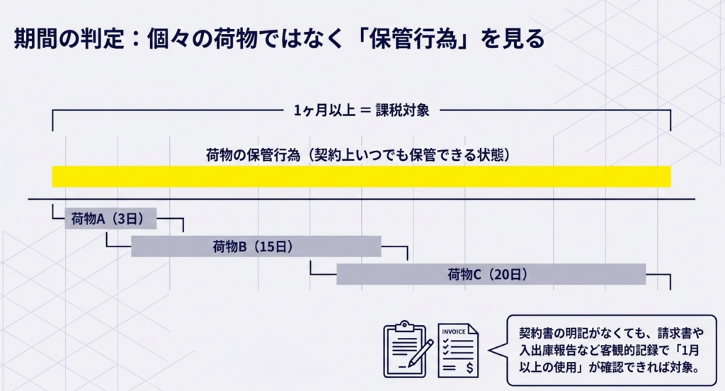 条件を満たす可能性があります。「1ヶ月以上」とは個々の荷物の保管期間ではなく、契約等によりいつでも保管できる状態を含む「保管行為全体の期間」を指すため、保管行為が1ヶ月以上継続していれば対象となります。
