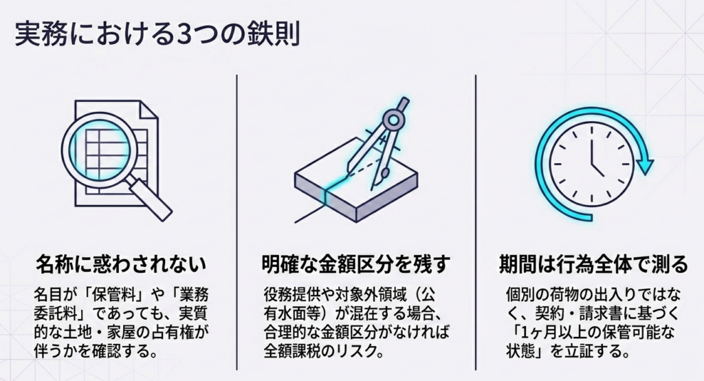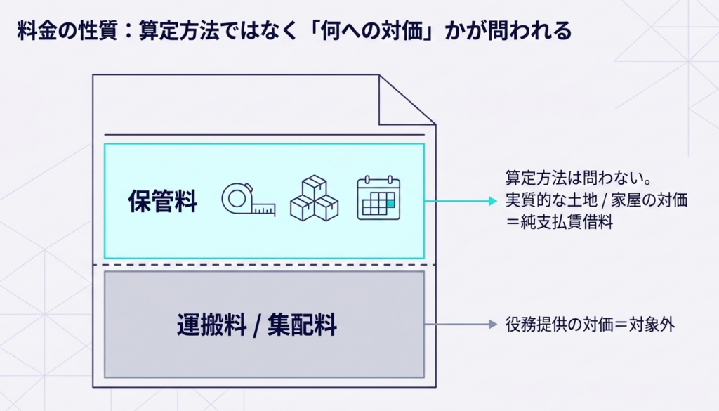 「場所の自由度があるから非該当」という安易な判断は危険です。保管料の中に役務対価(運搬・荷役等)が含まれている場合は、必ず契約書や請求書で内訳を明記させてください。この「区分」がないだけで、税負担が不当に重くなるリスクがあるからです。