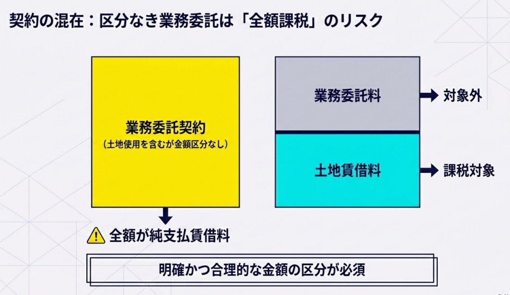保管と運搬、土地利用と業務委託が混在する契約では、合理的な内訳区分を設けない限り、当局から全額算入を迫られるリスクがあります。