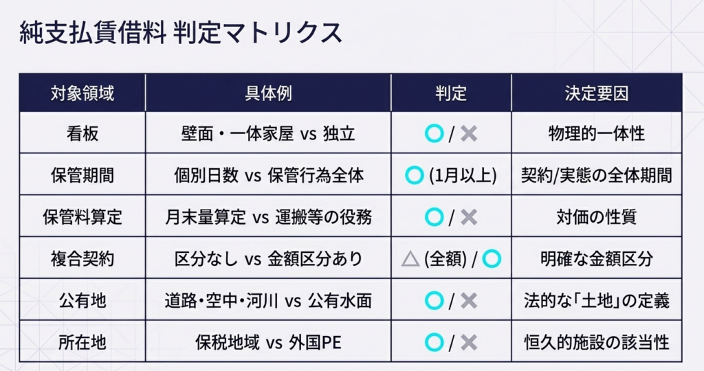 支払先や物件所在地が海外であっても、それが外国の恒久的施設(PE)に帰属する事業でない限り、原則として純支払賃借料に含まれます。保税地域の倉庫保管料も例外ではありません。