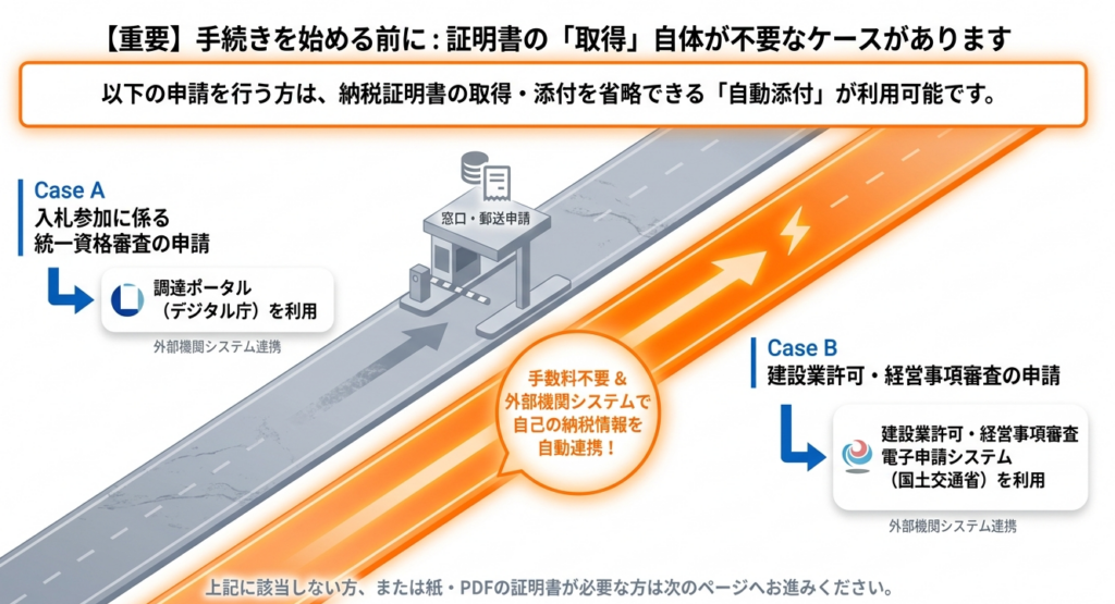 また、令和5年1月からは「調達ポータル」や「建設業許可・経営事項審査電子申請システム」において、手数料不要で納税情報を自動添付できる仕組みが稼働しています。これは事務手続の完全自動化を意味し、従来の「紙を取得してスキャン・添付する」というプロセスを過去のものにしています。