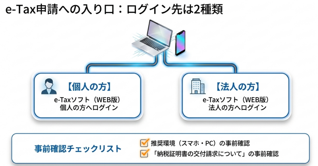 e-Taxソフト(WEB版)スマートフォン、タブレット、パソコンからオンラインで国税に関する申告や納税証明書の交付請求ができるシステム。