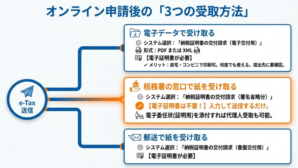 電子交付だけでなく、税務署窓口での受取や郵送も選択できます。