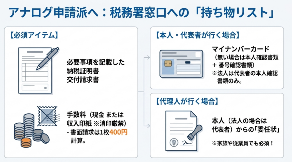 本人以外が窓口で請求する場合、委任状が必須となります。なお、オンライン請求でも「電子委任状(証明用)」を添付すれば代理請求が可能です。 ここで重要なのは、代理人が「業務として」他人の納税証明書を請求することは、税理士法上の「税務代理」(納税者の代理として税務当局に対する手続を行うこと)に該当する点です。資格のない者が業としてこれを行うことは法的に厳格に制限されているため、不用意な代行は避けるべきです。