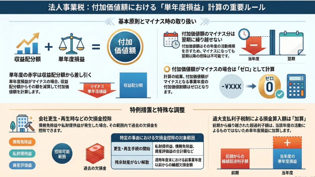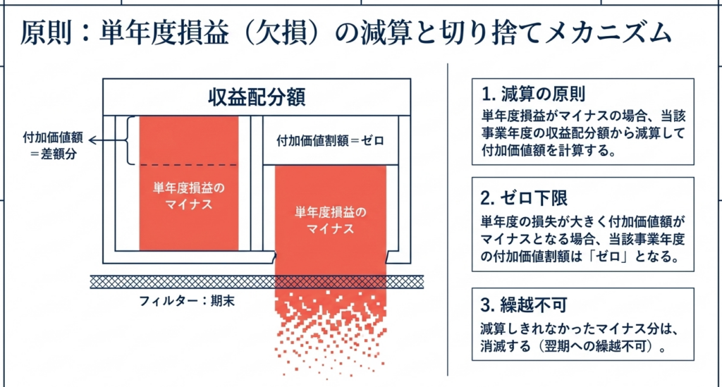 単年度の損失が収益配分額を上回り、付加価値額がマイナスとなる場合には、当該事業年度の付加価値割額はゼロとして扱われます。