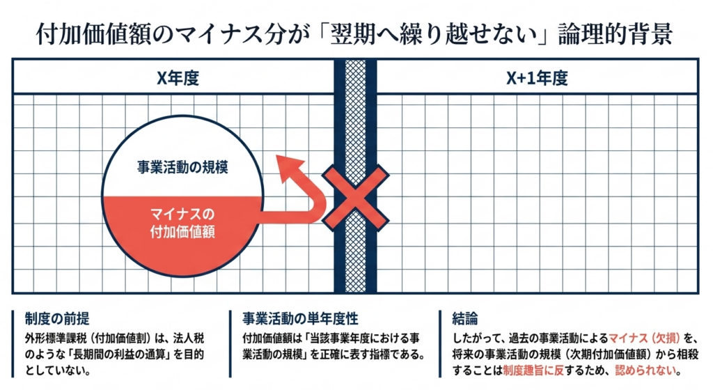 法人税における所得計算では、欠損金の繰越控除によって「過去の赤字を将来の黒字で埋める」という年度をまたいだ調整が当然視されています。しかし、付加価値割の本質は「その年度に行われた事業活動の規模」に対する課税です。したがって、単年度損益がマイナスとなった場合、法人税のように翌期以降へ損失を繰り越すことは原則として認められません。