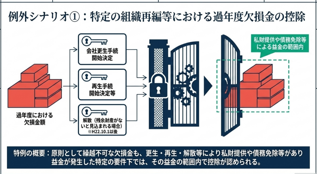 | 2. 更生手続開始決定があった場合 | 可能 | ① 私財提供益、債務免除益、資産評価益の合計額 ② 適用年度末における前事業年度以前から繰り越された欠損金額(期間制限なし) |