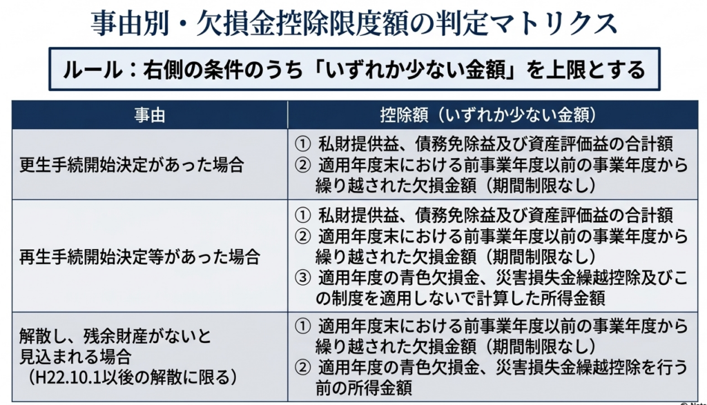 「私財提供益、債務免除益および資産評価益の合計額」と、「適用年度末における前事業年度以前からの繰越欠損金額(期間制限なし)」を比較し、いずれか少ない方の金額が限度となります。