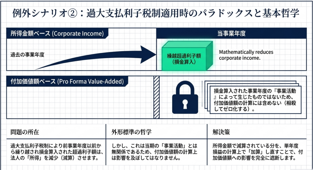 繰り越された超過利子額は、損金算入された当該事業年度の事業活動によって生じたものではないためです。付加価値額は単年度の活動を反映させる必要があるため、過去に起因するこの額は除外されます。