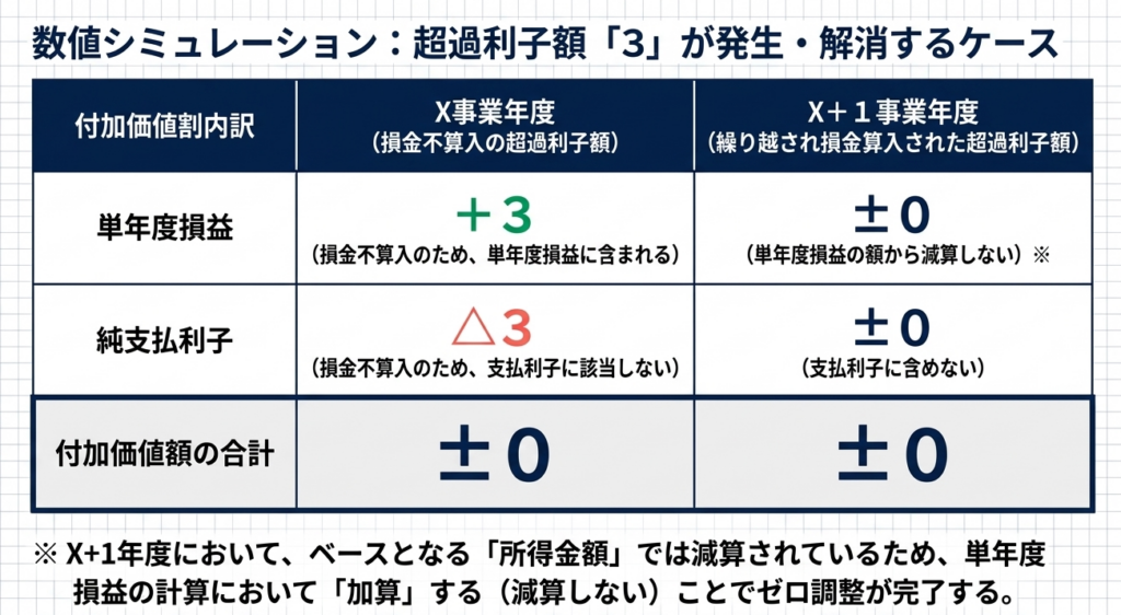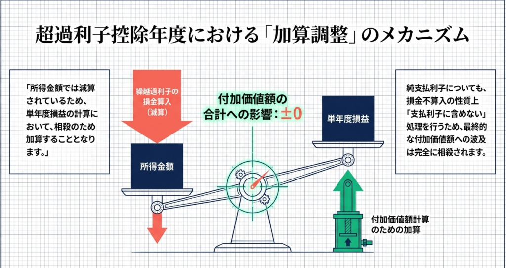 この際、加算した利子額は「純支払利子」の計算にも含めない(±0とする)ことで、付加価値額全体の整合性を保ちます。