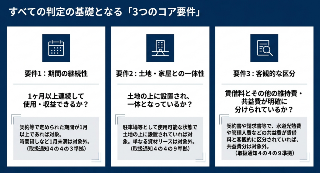 判定においては、契約書の名目(形式)以上に「利用の実態」が重視されます。利用期間の通算、対象物の性質(土地との一体性)、費用区分の客観性など、通達に基づいた多角的な検証が不可欠です。本ガイドでは、実務担当者が直面しやすい判断のグレーゾーンを、当局の質疑応答に照らして解明します。