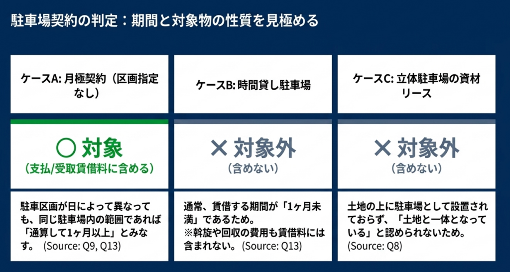 対象となるのは、土地・家屋の使用期間が「連続して1か月以上」のものです。月極の駐車場契約は、区画指定がなく空き区画を利用する場合であっても対象となりますが、時間貸し駐車場は通常1か月未満であるため対象外です。また、立体駐車場の資材等のリース料は土地と一体と認められないため除外されます。