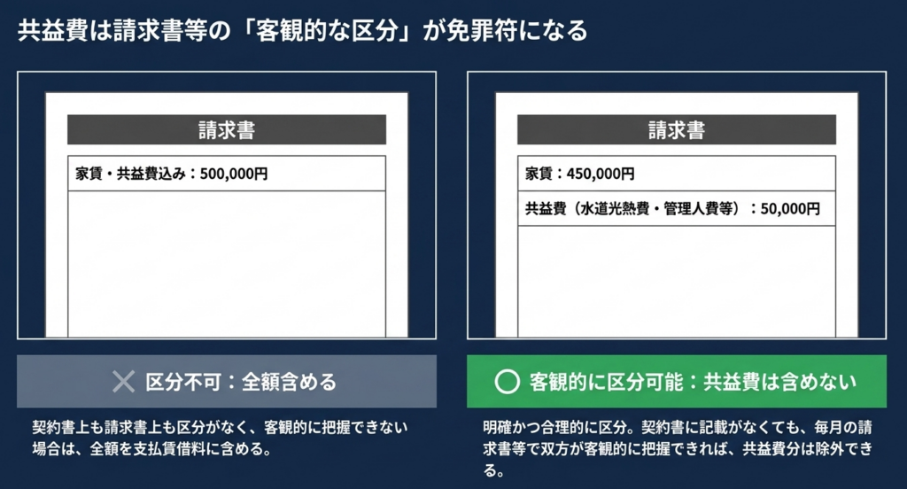 共益費(水道光熱費・管理費等)不算入契約書や請求書で賃借料と客観的に区分されている場合(Q10)。