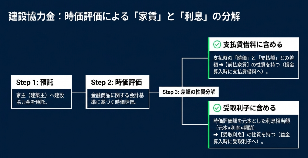 受取利子として取り扱われます。建設協力金の時価評価額を元本とし、「元本×利率×期間」で求められる受取利息は、法人税の所得計算上、損金または益金となる事業年度において受取利子の対象となります。