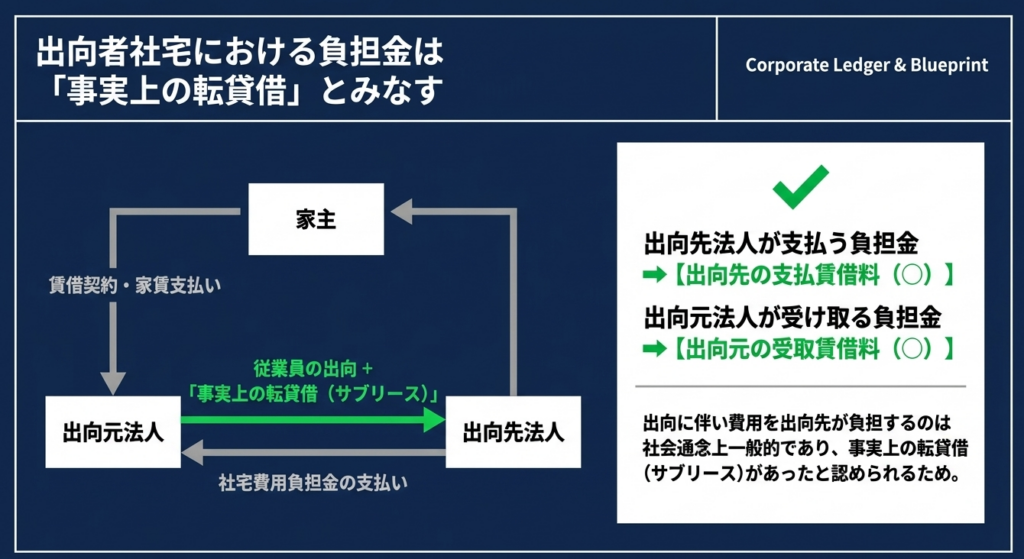 事実上の「転貸借」があったものとみなされます。出向元法人が借り上げた社宅の費用を出向先が負担することは社会通念上一般的であり、出向先にとっては支払賃借料、出向元にとっては受取賃借料となります。