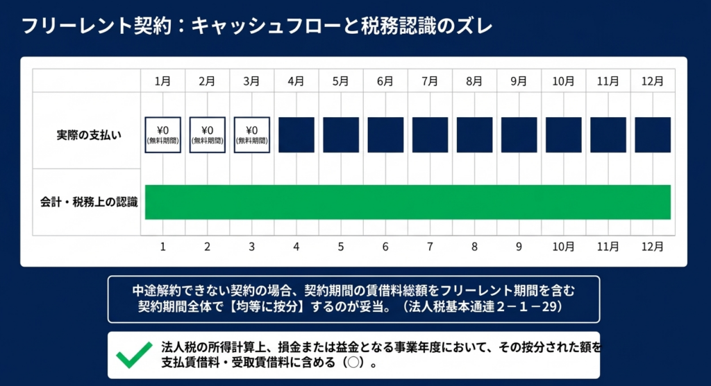 フリーレント期間の按分費用算入法人税法上の損金算入時期(中途解約不能期間での按分等)と連動(Q14)。