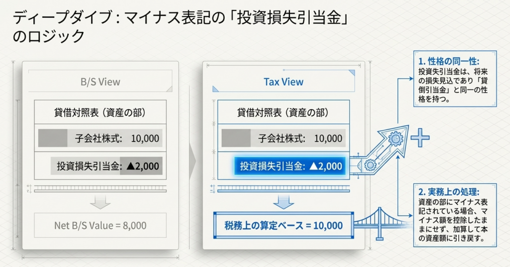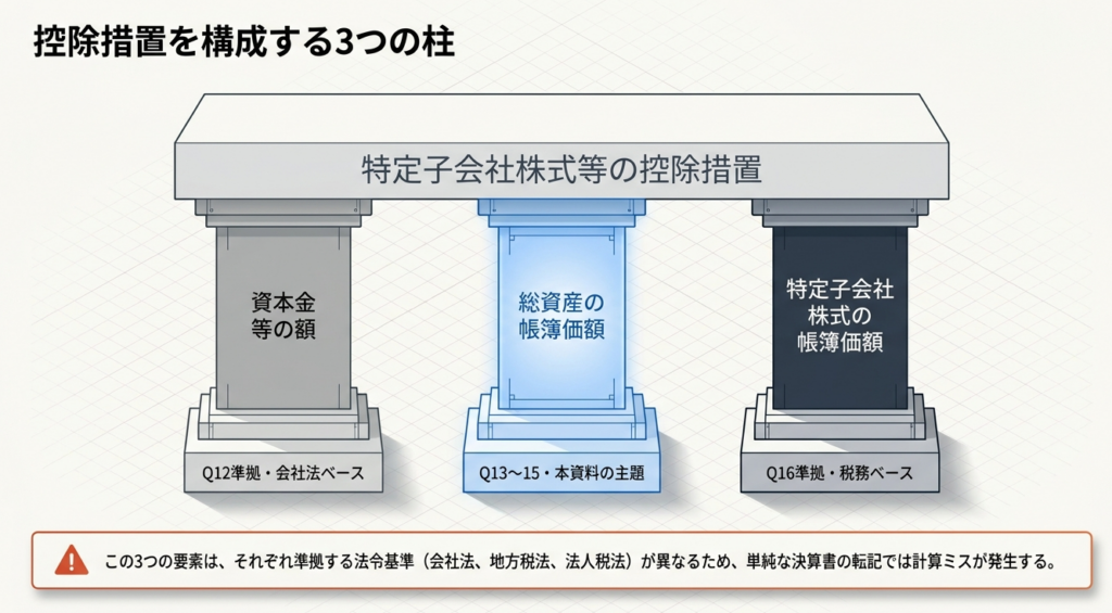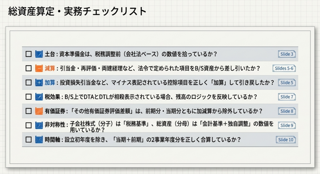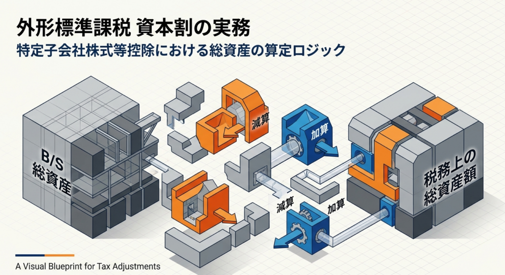 「特定子会社株式等の控除」を計算する際、分母となる「総資産の帳簿価額」は会計上のB/S数値をベースに調整を行います。特に「投資損失引当金」の扱いや税効果会計の処理順序はミスが多いため、注意が必要です。