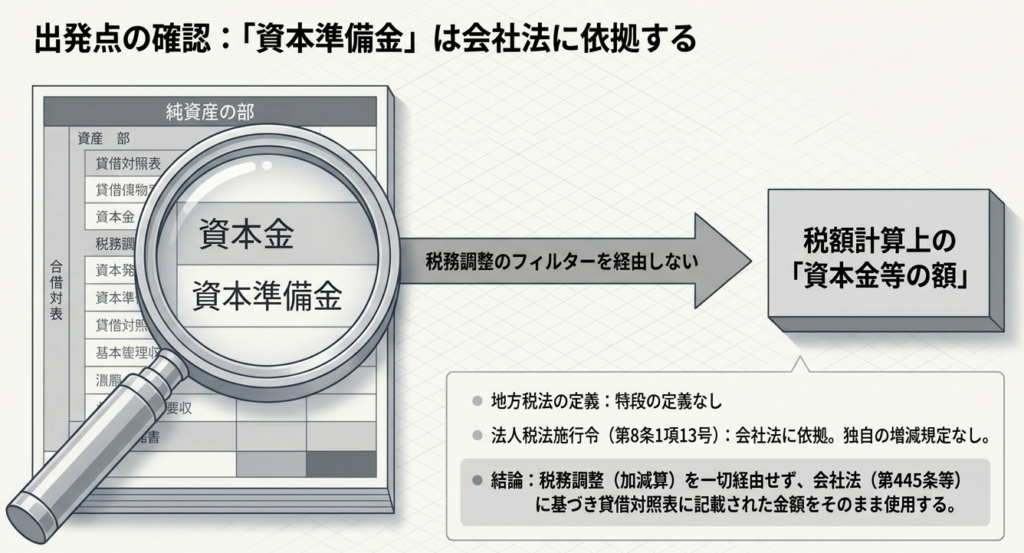 地方税法には資本準備金の独自の定義がないため、会社法(第445条等)および会社計算規則(第76条第4項第1号)に基づき、貸借対照表(B/S)に計上されている金額をそのまま用います。 - 法人税法との整合性: