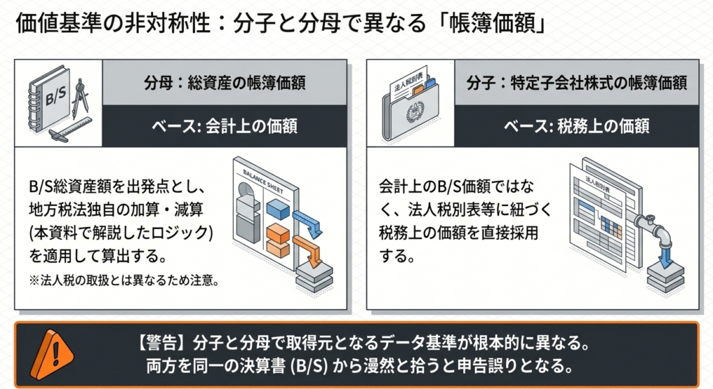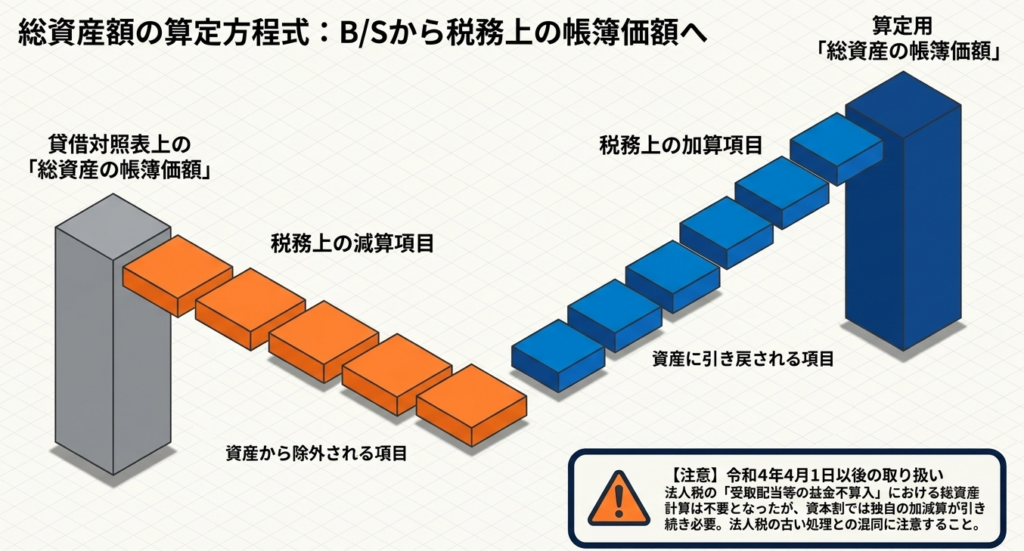 | 総資産の帳簿価額 | 会計上のB/S数値 + 地方税法固有の加減算 | 会計上の総資産額をベースに、地方税法施行令第20条の2の22および取扱通知に基づき、特定の項目を加減算して算出する。 |