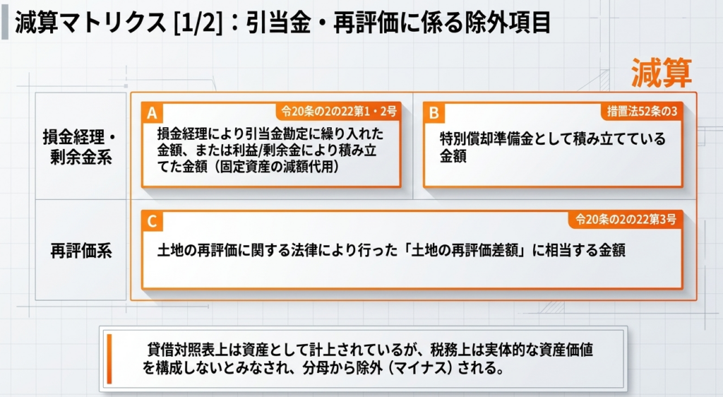 B/S計上額はそのまま総資産に含めます。 - 圧縮積立金等の控除額算定: