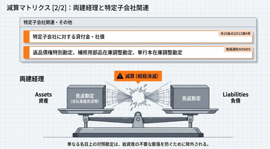 支払承諾見返勘定又は保証債務見返勘定のように、単なる対照勘定として貸借対照表の資産及び負債の部に両建経理されている金額は、総資産の帳簿価額から減算します。これは取扱通知4の6の5(1)に基づきます。